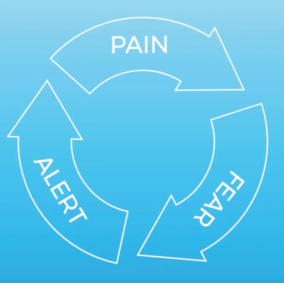 Pain induces fear, which heightens our alertness, subsequently leading to more pain. This increased pain then results in greater fear, continuing the vicious cycle.